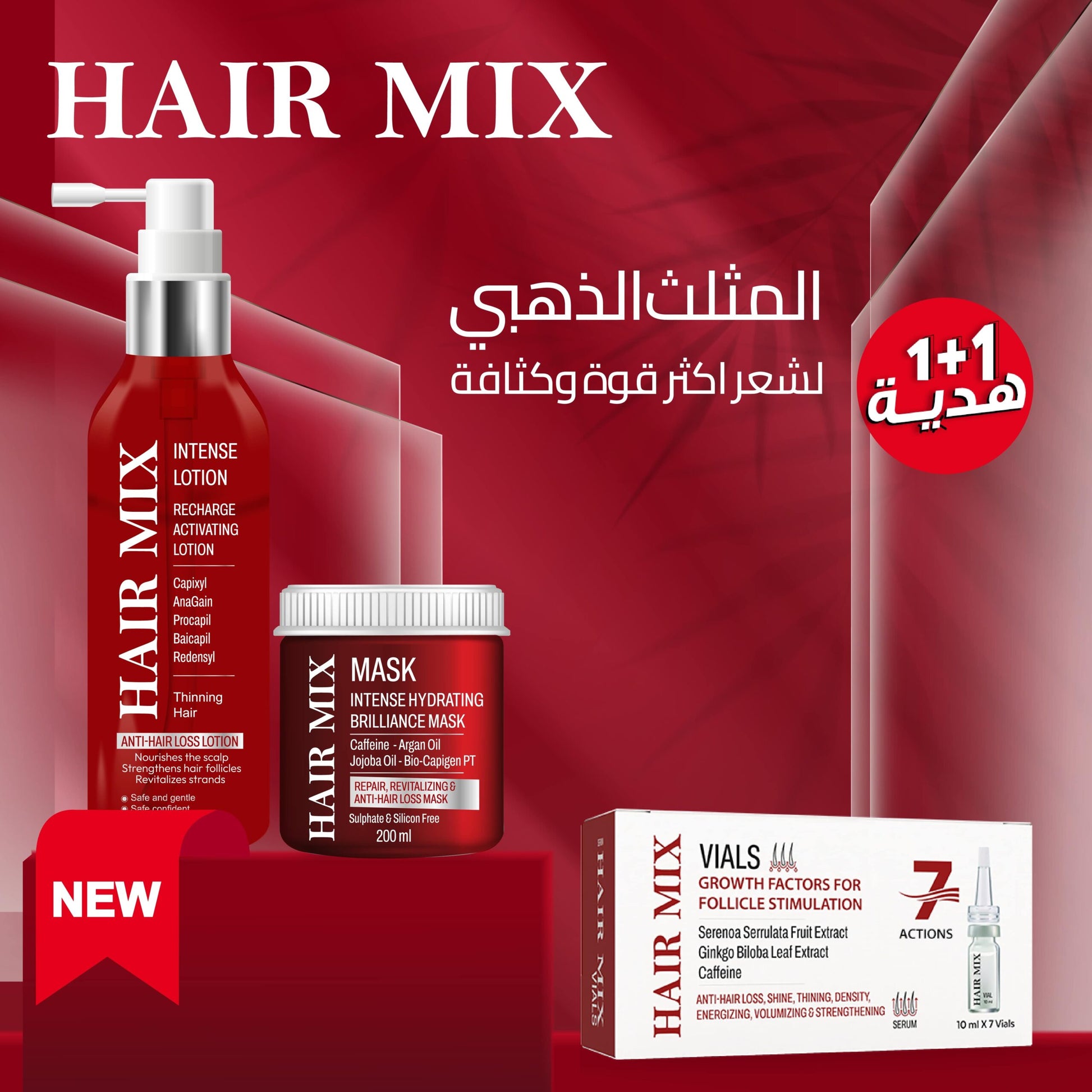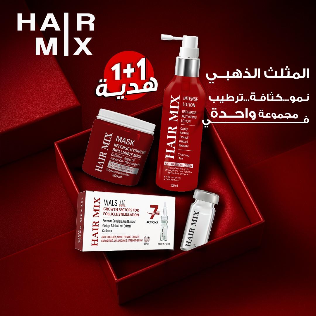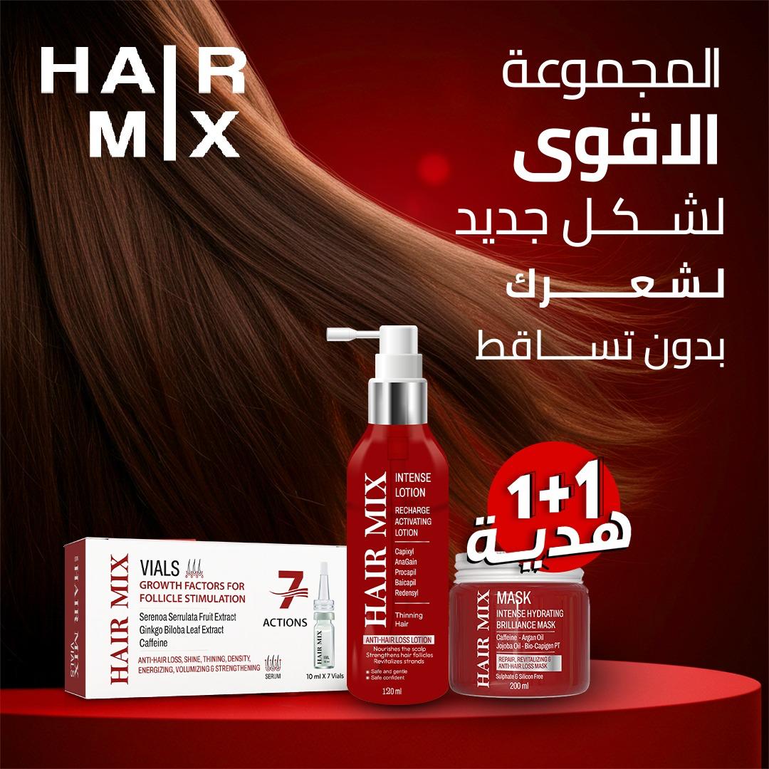Hair Mix vials (7 glass vials) - هير ميكس أمبولات المضادة لتساقط الشعر (70 مل) تركيبة فائقة التركيز تُعيد دورة حياة الشعر الصحية، مما يُعزز قوته وكثافته. غني بمكونات فعالة ، لوقف تساقط الشعر من جذوره. استخدميه لمدة 3 أشهر على الأقل لنتائج ملحوظة. Hair Mix intense lotion 120 ml - هير مكس لوشن: حل فعال لوقف تساقط الشعر مخصص لحل كل أنواع مشاكل الشعر بفضل تركيبته المتطورة المدعمة بمركب RCP تقوي بصيلات الشعر و تعزز نموه و تحفز فروة الرأس و تعطي نتائج ملحوظة خلال ٦ أسابيع يستخدم يومياً لشعر أكثر كثافة و قوة