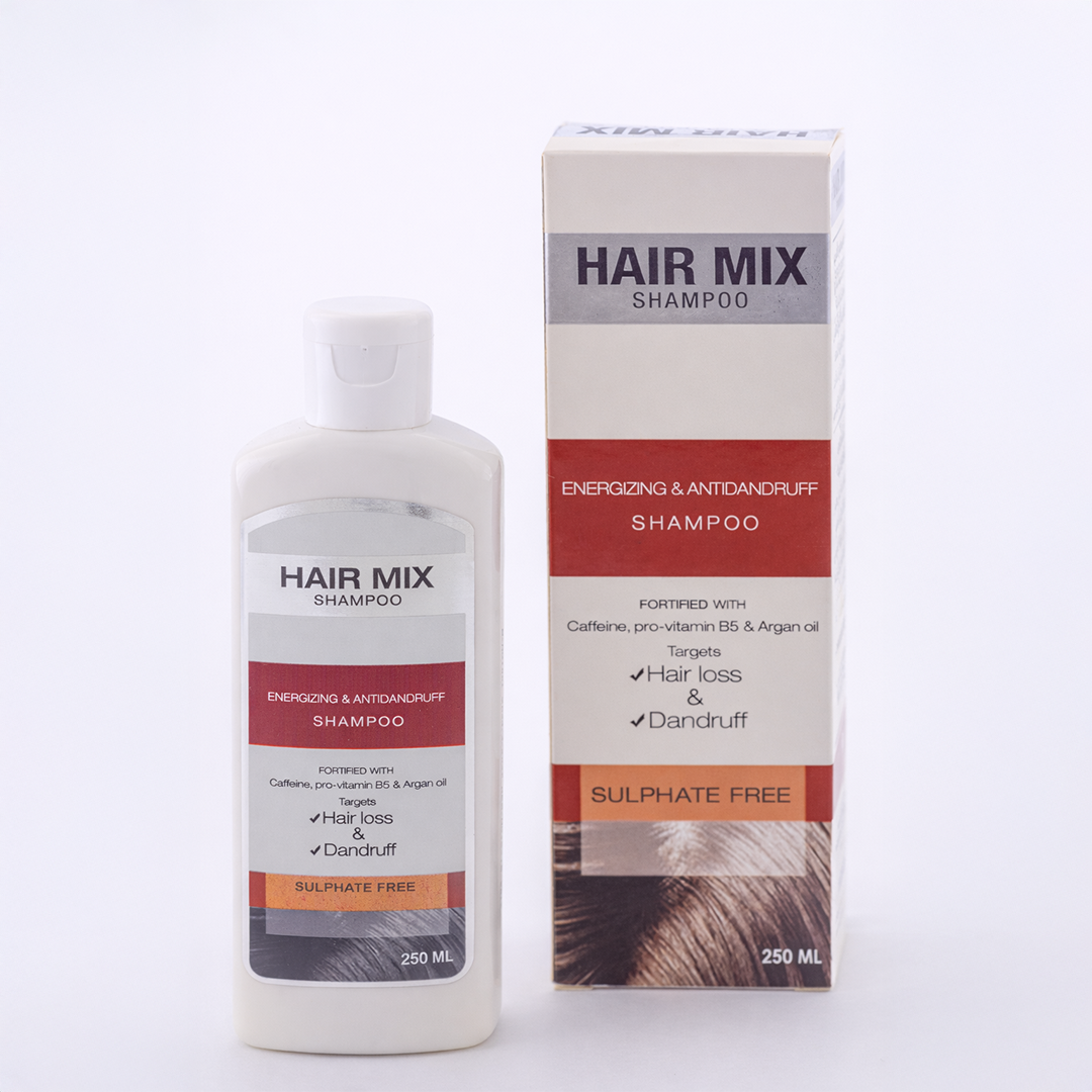 • Hair Mix Shampoo – شامبو علاجي خالي من السلفات بالكافيين والزنك لمكافحة القشرة وتنظيف الفروة بلطف.