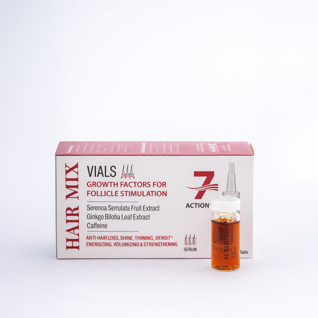 • Hair Mix Vials – أمبولات مكثفة بعوامل نمو وكافيين لدعم البصيلات وإنبات الفراغات.